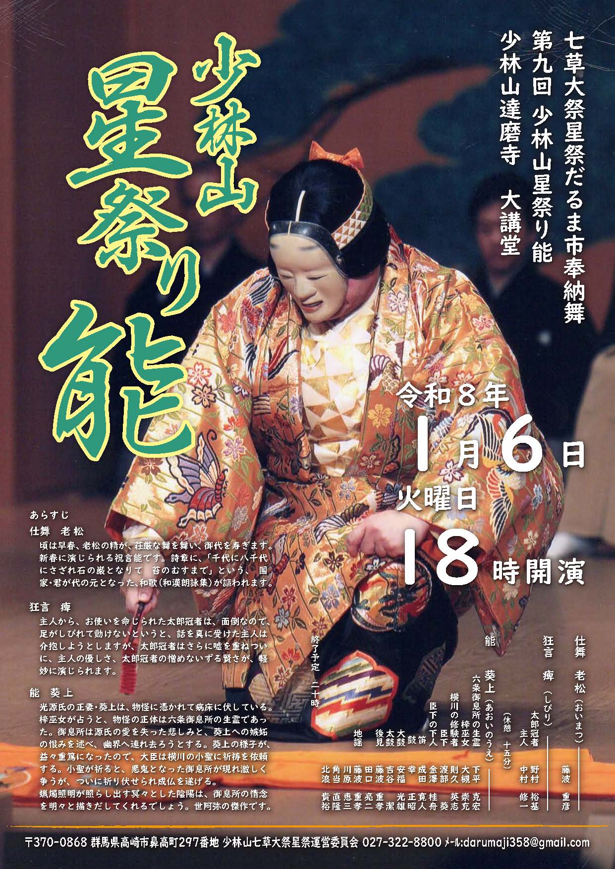 お知らせ 第9回 星祭り奉納舞 少林山星祭り能 2025.10.28 お知らせ 令和8年少林山七草大祭だるま市で星祭り能を開催いたします。 お申込は下記の申込用紙をダウンロードいただきご記入の上FAX(027-322-3083)又はメール(daruma@daruma.or.jp)までお送りください。 ①星祭り能 座席表2027ダウンロード 前の記事次の記事 一覧に戻る