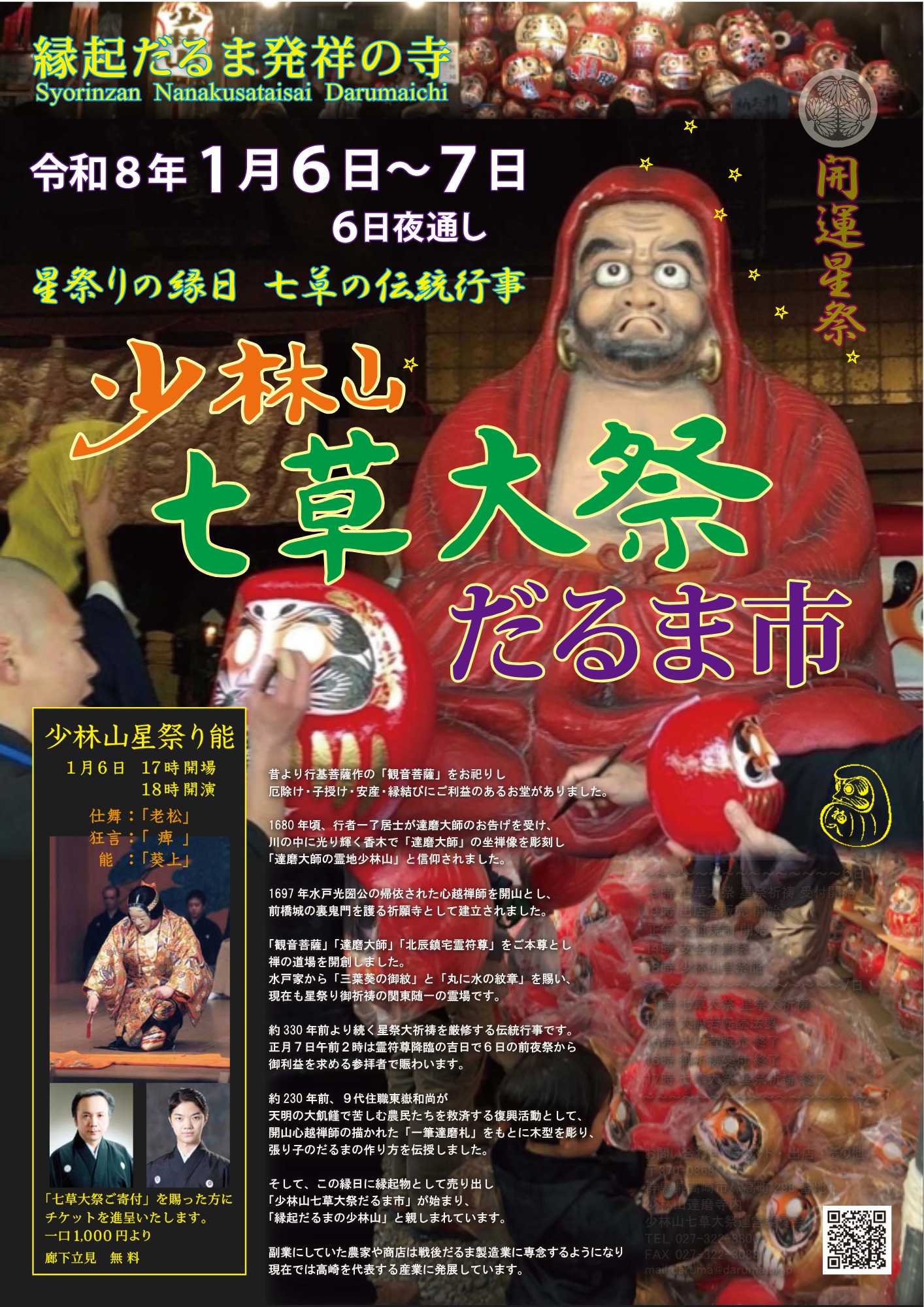 お知らせ 令和8年少林山七草大祭だるま市のご案内 2025.12.01 お知らせ 本堂前にはだるま店が出店し、本堂裏には約30台のキッチンカーが集結します!!今年は飲食スペースもご用意いたします!! 交通規制があります下記の地図を参考にお気をつけてお越しください。 前の記事 一覧に戻る